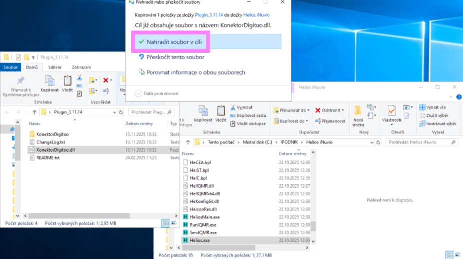 3. Soubor KonektorDigitoo.dll zkopírujte do složky, ve které máte nainstalovaný Helios a nahraďte původní KonektorDigitoo.dll tímto novým z aktualizačního staženého souboru (složky)