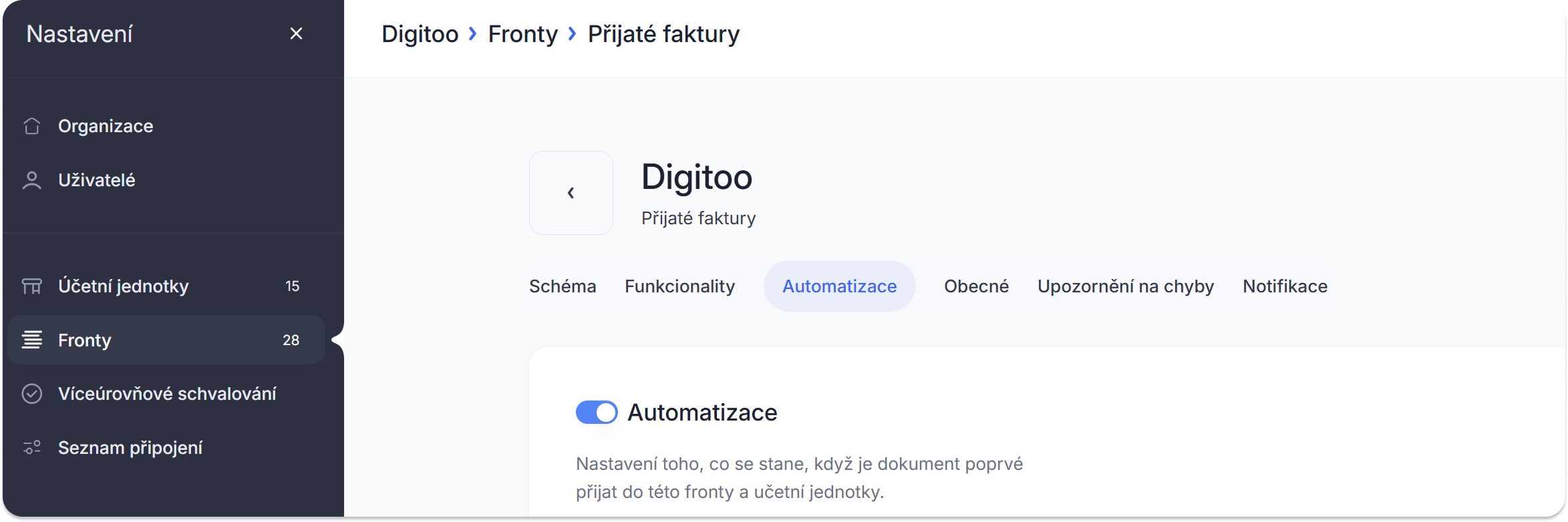 Pokud v Digitoo nepoužíváte funkci víceúrovňového schvalování, pak máte v každé frontě buď záložky Ke schválení, Ke kontrole a Odeslané, nebo pouze Ke kontrole a Odeslané. Pro nastavení automatizace u dané fronty klikněte na tlačítko Nastavení v levém horním rohu obrazovky. Následně na záložku Fronty. Přes tři tečky vpravo u dané fronty si vyberte Nastavení fronty. Zde se překliknete do záložky Automatizace.