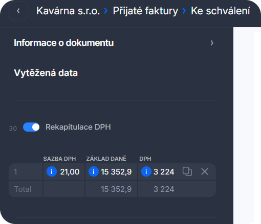 Dopočty v rámci rekapitulace se vám můžou hodit pro situace, kdy je na dokladu například pouze částka celkem včetně DPH a jeho sazba a potřebujete dopočítat částku DPH nebo například si změníte sazbu DPH na svojí vlastní.