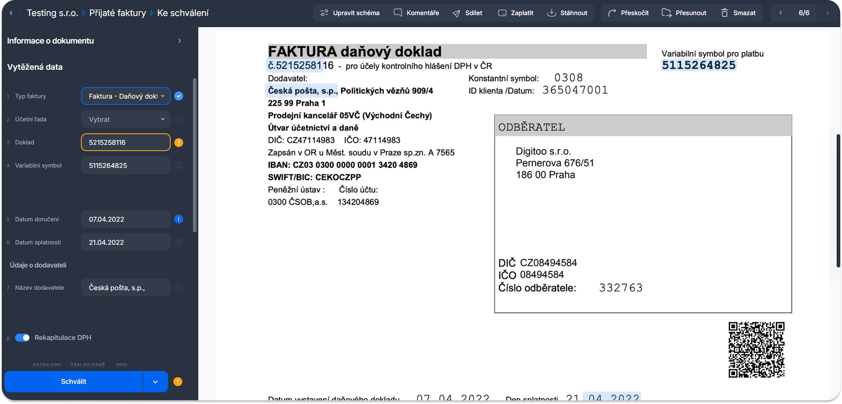 Po automatickém přiřazení má uživatel možnost kontrolovat a schvalovat faktury. Systém Digitoo.ai umožňuje jednoduché víceúrovňové schvalování v souladu s nastavenými pravidly.
