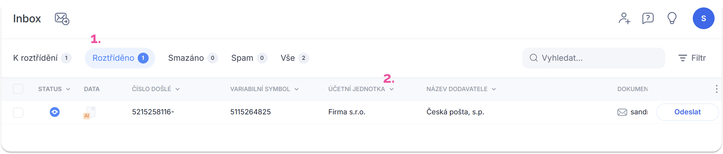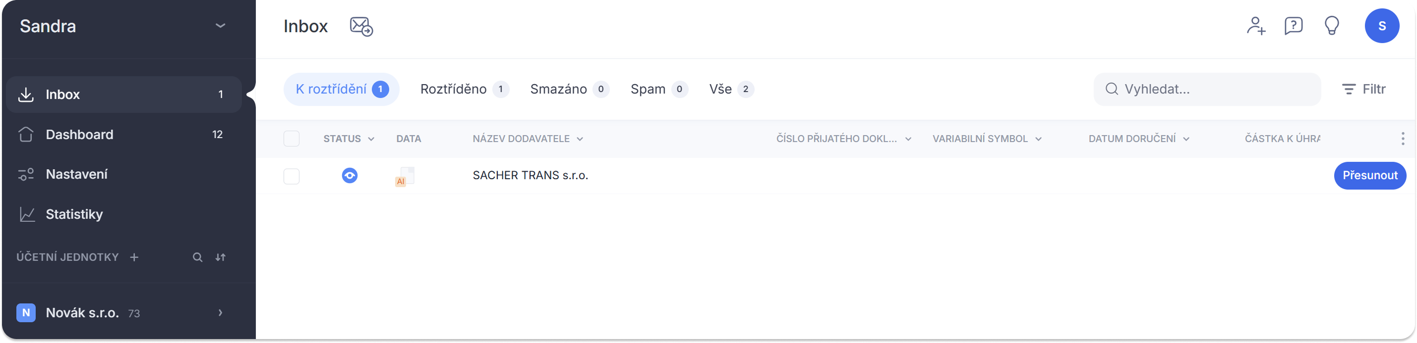 V Inboxu je k dispozici záložka, kde vidíte, co již bylo roztříděno, co ještě ne, a kam se doklad případně přesunul.