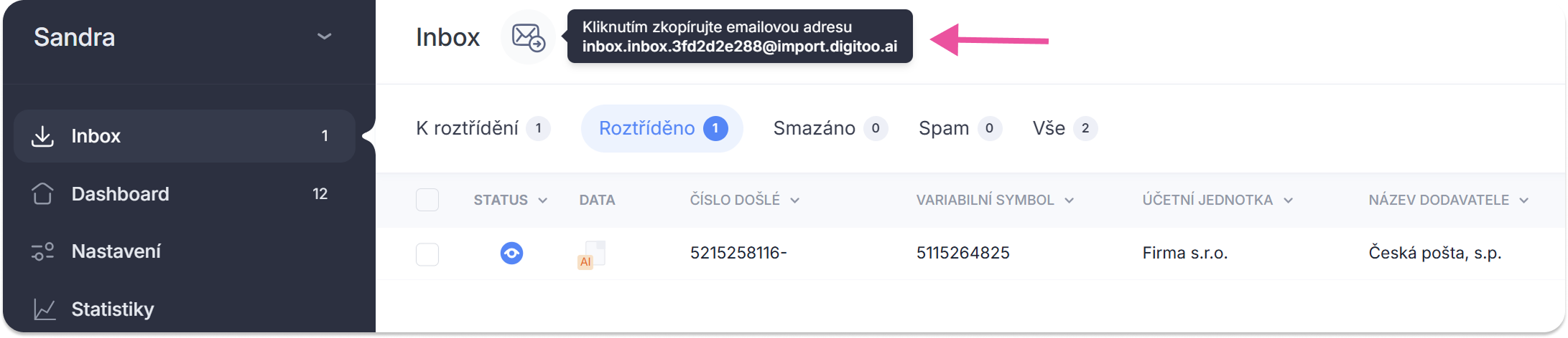 AI Inbox je placené rozšíření, které slouží k automatickému třídění přijatých dokladů (přijaté faktury a účtenky) vaší organizace.