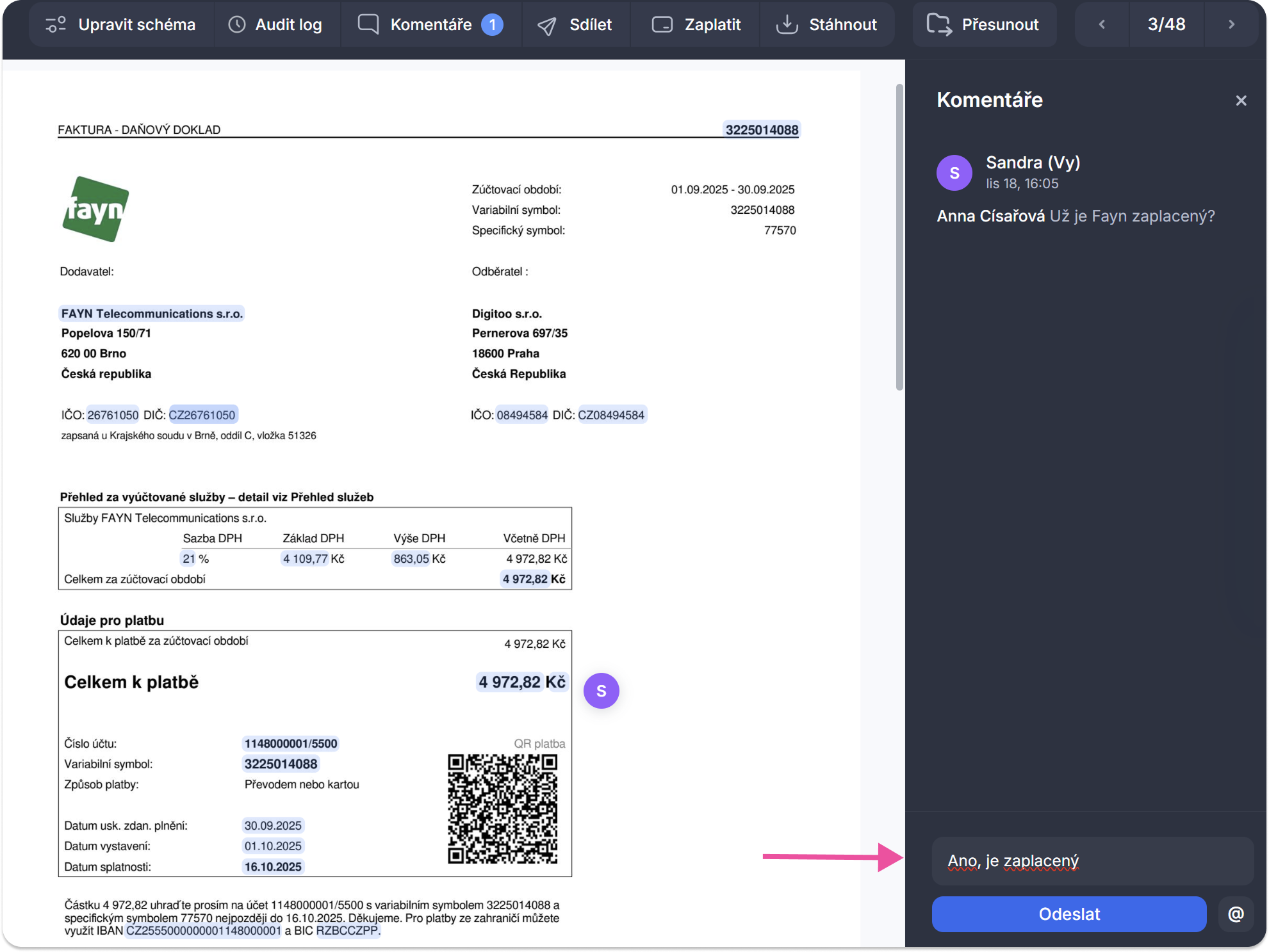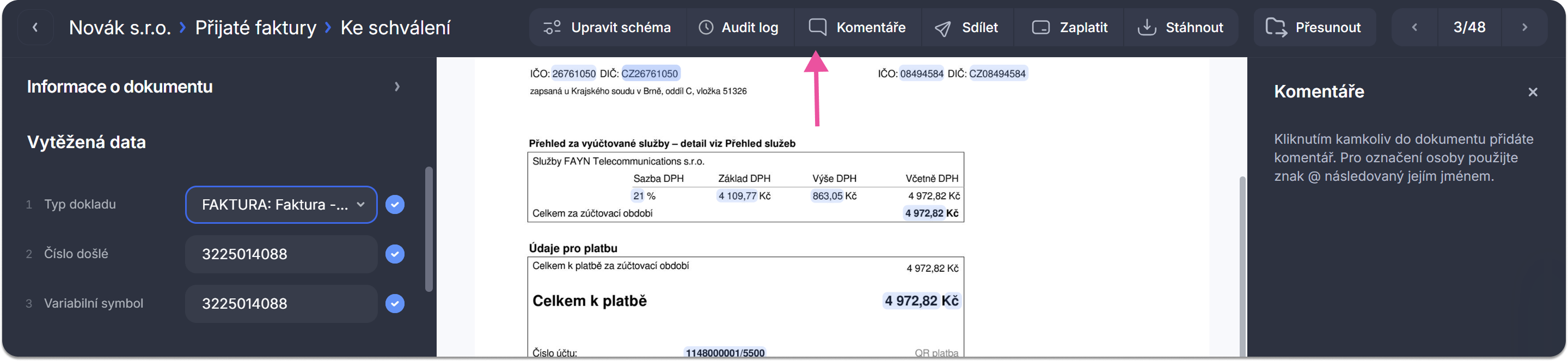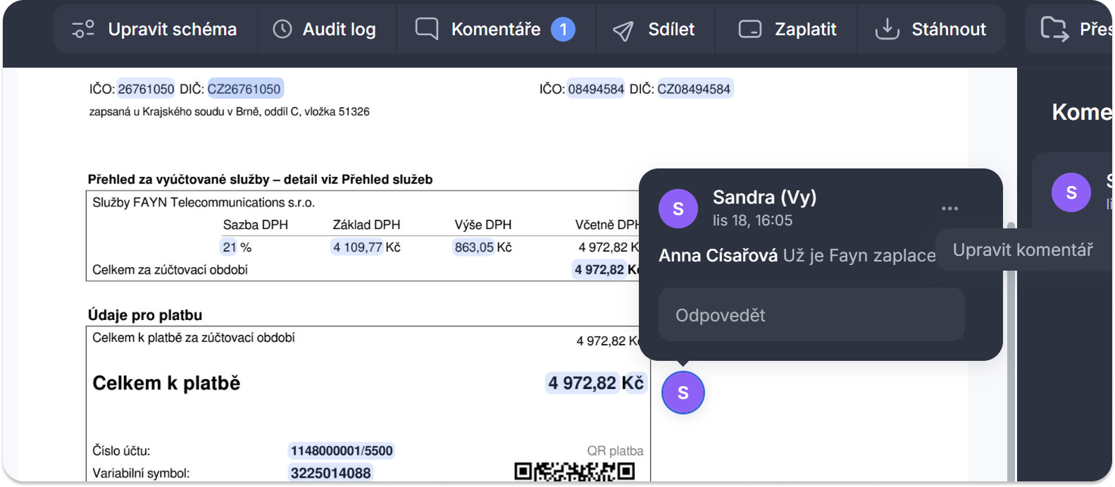 Můžete tak umístit komentář na konkrétní řádek faktury, popis položky, částku nebo datum, zkrátka kamkoliv potřebujete, abyste přesně ukázali, čeho se váš komentář týká.