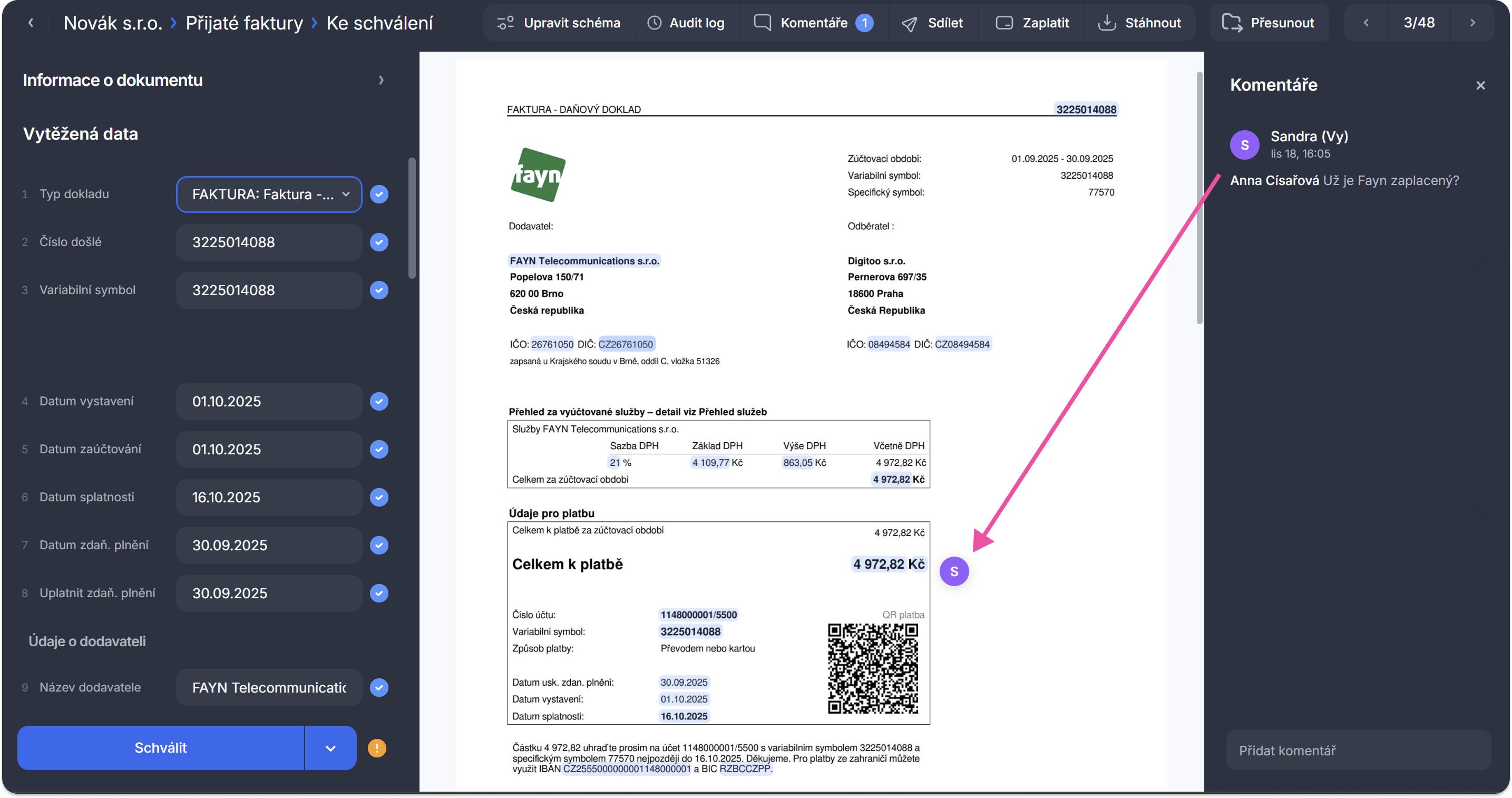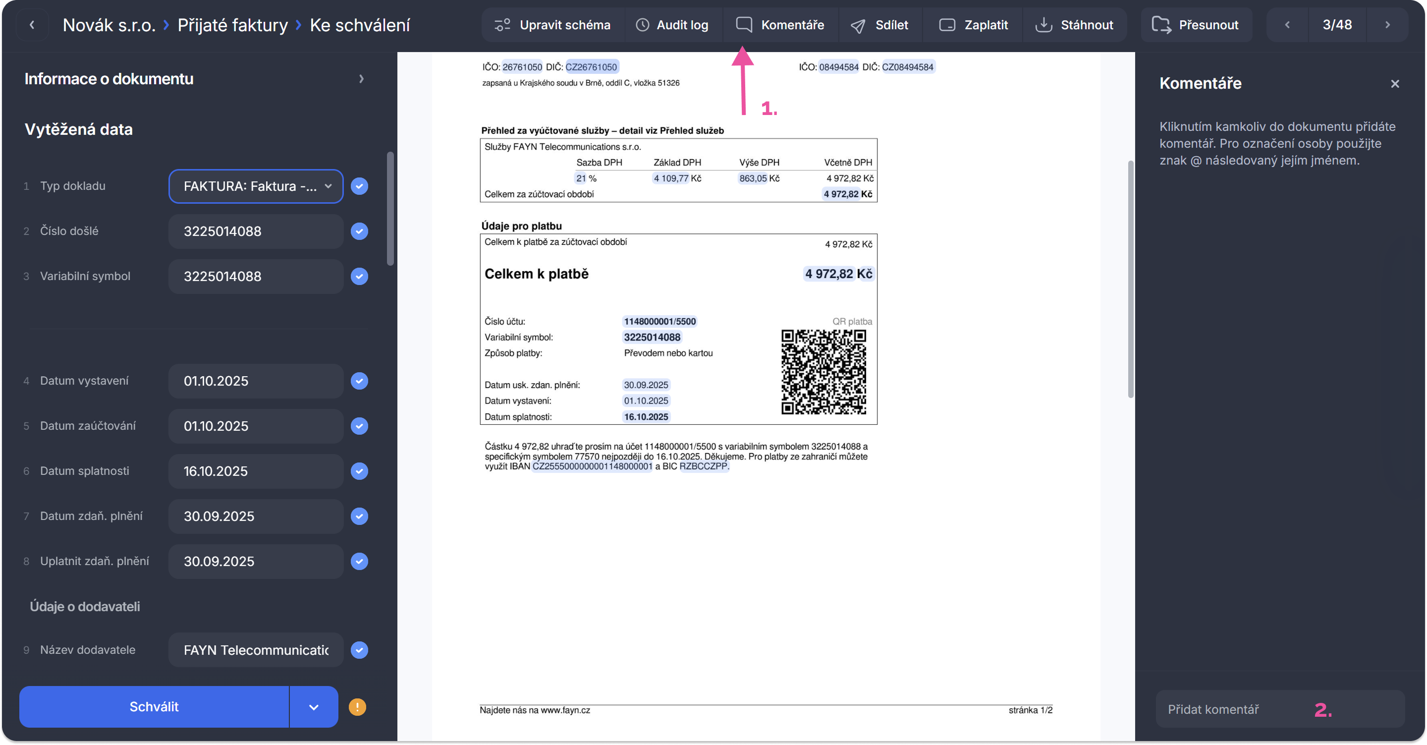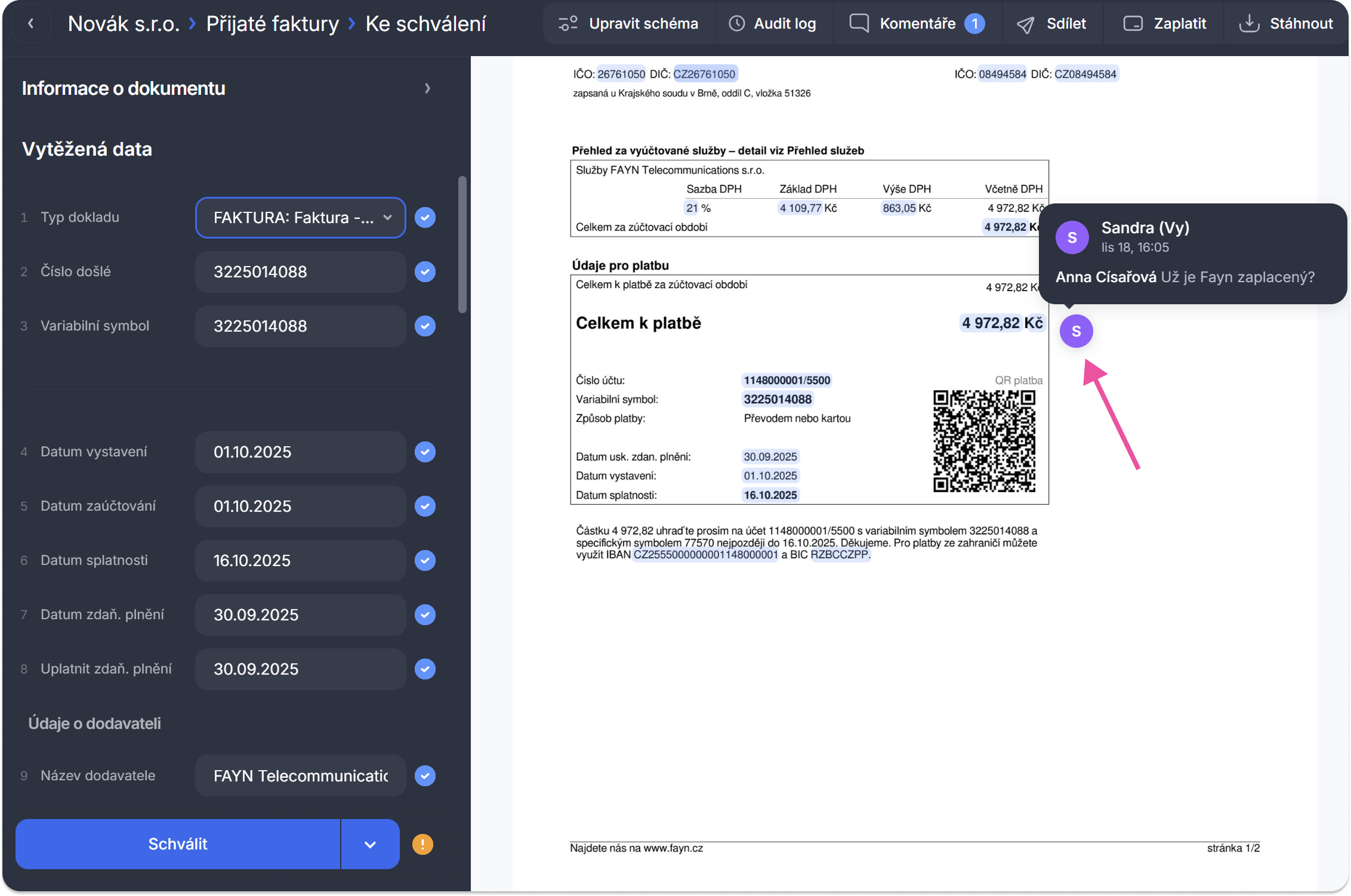Můžete tak umístit komentář na konkrétní řádek faktury, popis položky, částku nebo datum, zkrátka kamkoliv potřebujete, abyste přesně ukázali, čeho se váš komentář týká.