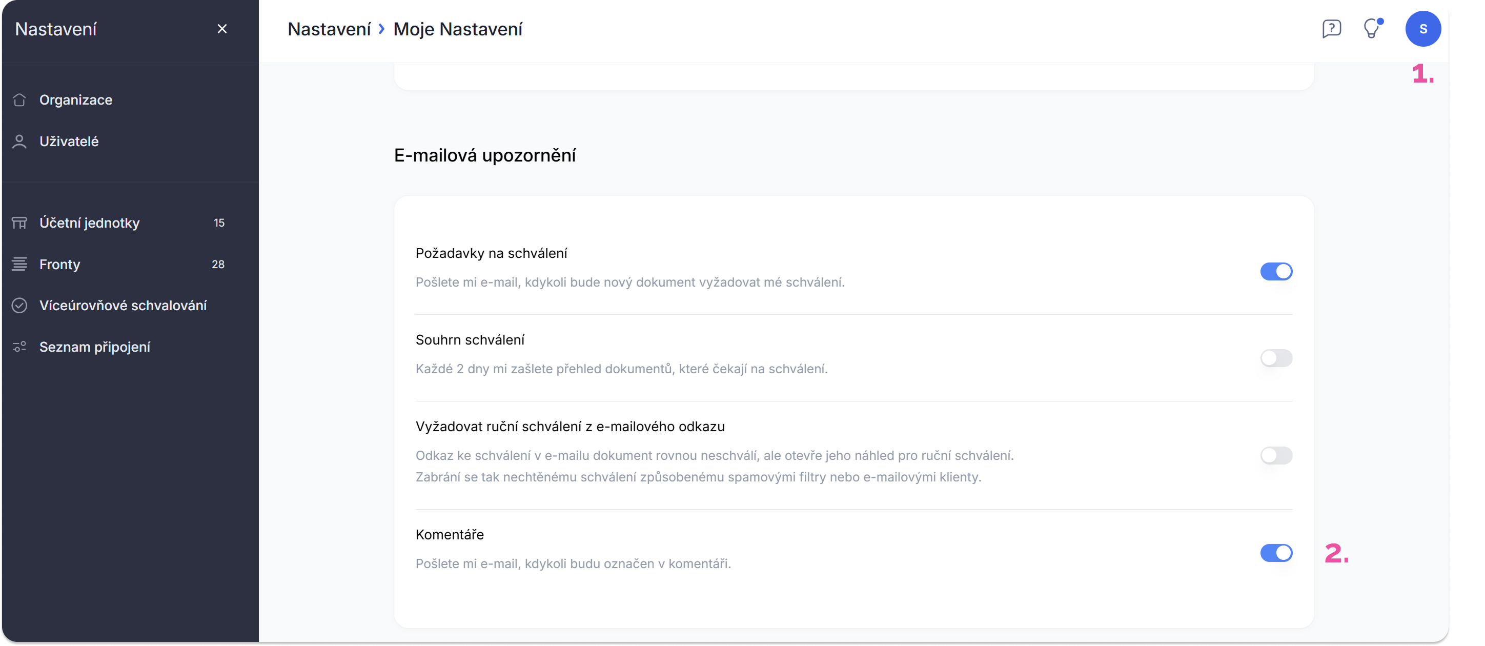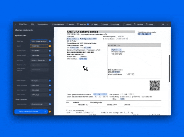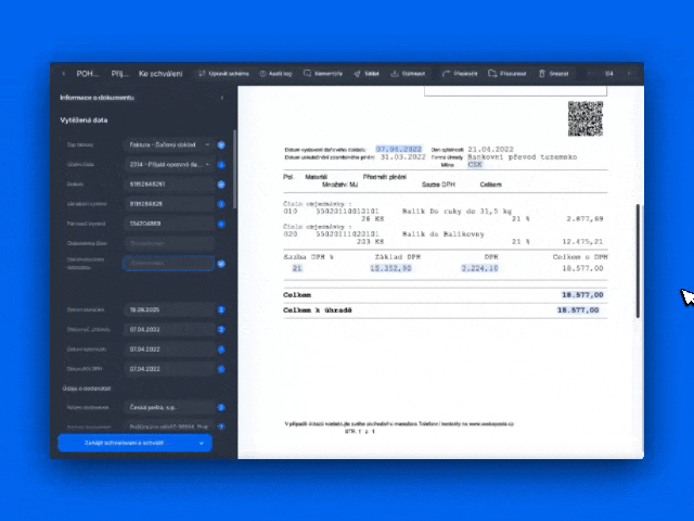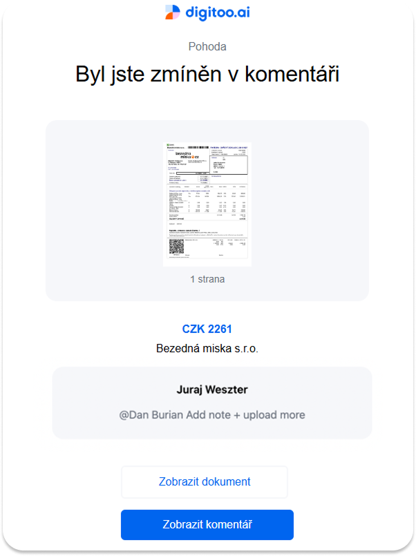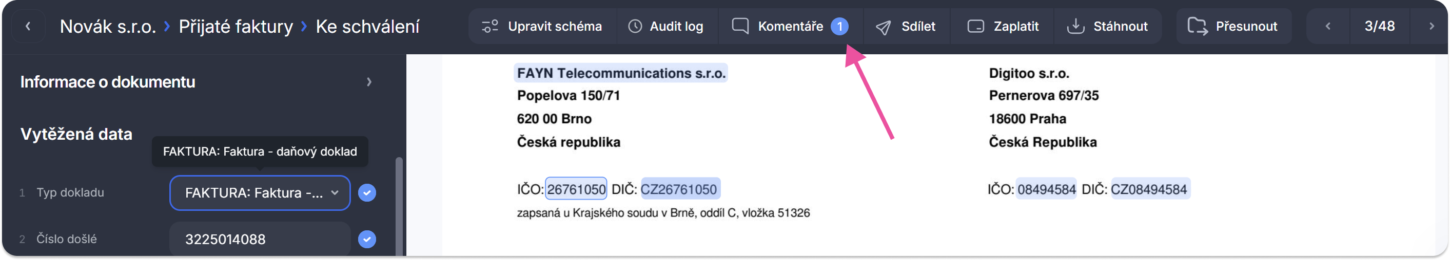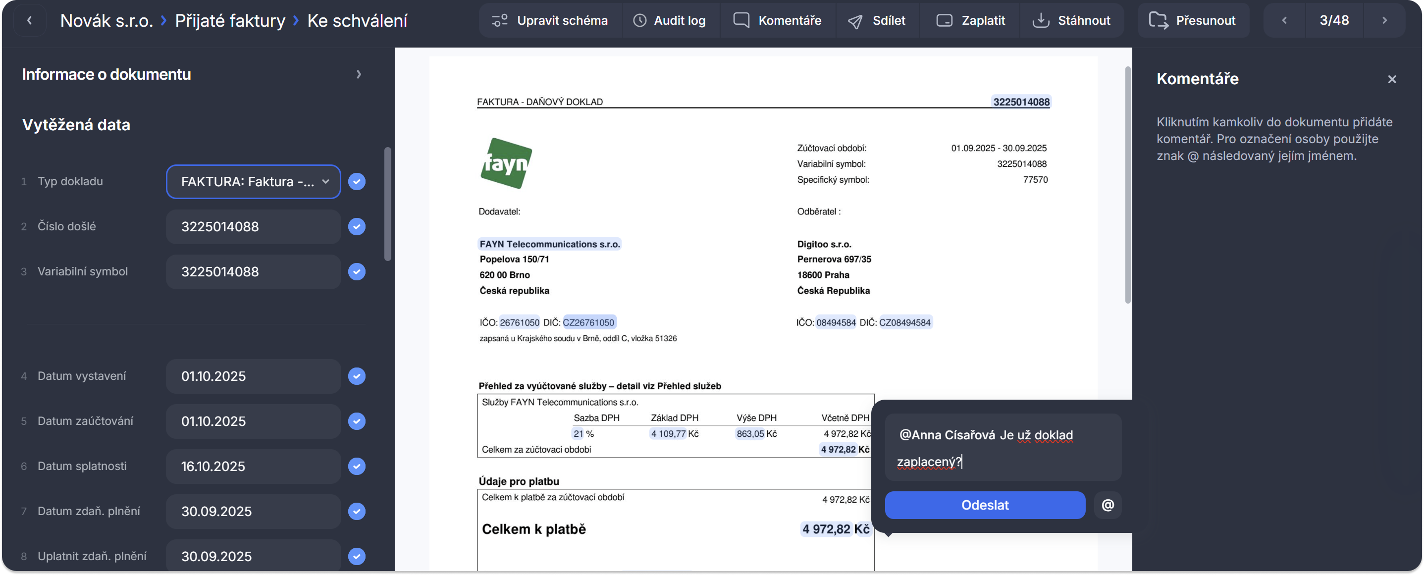 Tato funkce slouží k centralizované a kontextové komunikaci přímo u konkrétního dokladu. Umožňuje uživatelům diskutovat nejasnosti, žádat o doplňující podklady pro schválení a zaznamenávat důležité poznámky. Klíčovou výhodou je, že nahrazuje emailovou komunikaci a udržuje všechny informace a rozhodnutí k fakturám na jednom místě v rámci aplikace, což výrazně zrychluje a zpřehledňuje proces schvalování.