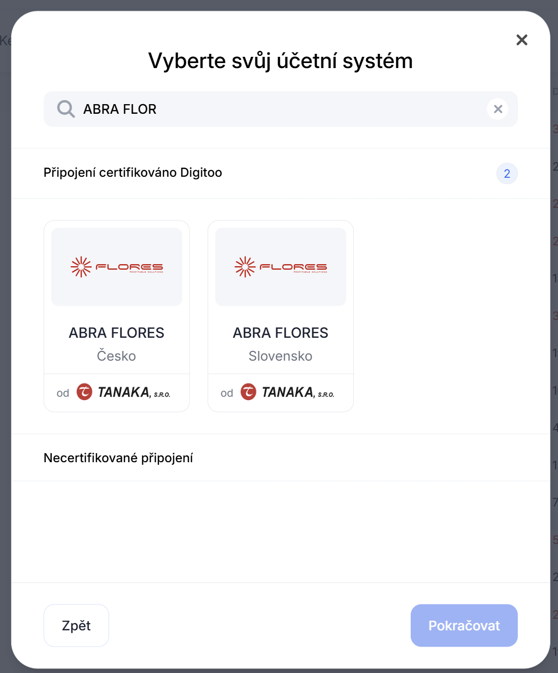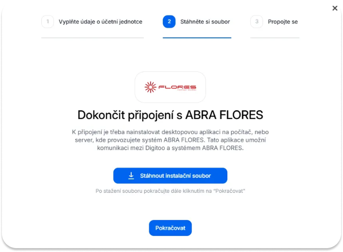 Jako první vyberte prosím svůj region. Dále vyberte druh účetního systému ABRA FLORES (CZ nebo SK dle vašeho regionu) a potvrďte volbou ,,Pokračovat”.