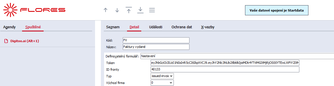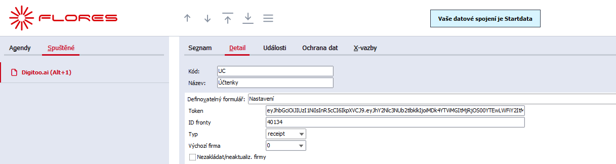 V tuto chvíli je účetní jednotka připojena a veškeré zpracované faktury budou ze strany Digitoo.ai zaslány přímo do Vašeho účetního systému Flores.