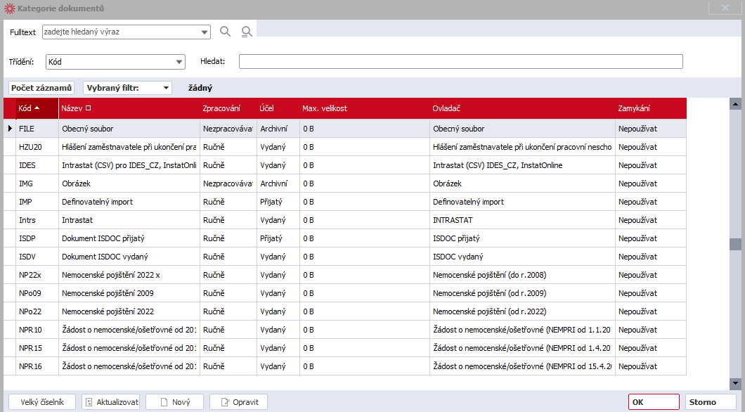 1. Jako kód uveďte zkratku, která Vám bude vyhovovat (např. FP) a název (jaký druh dokladů se jedná např. Faktury přijaté).