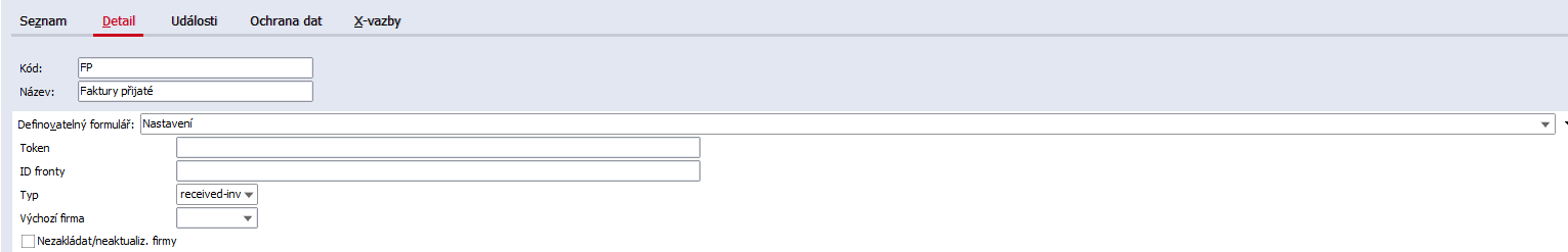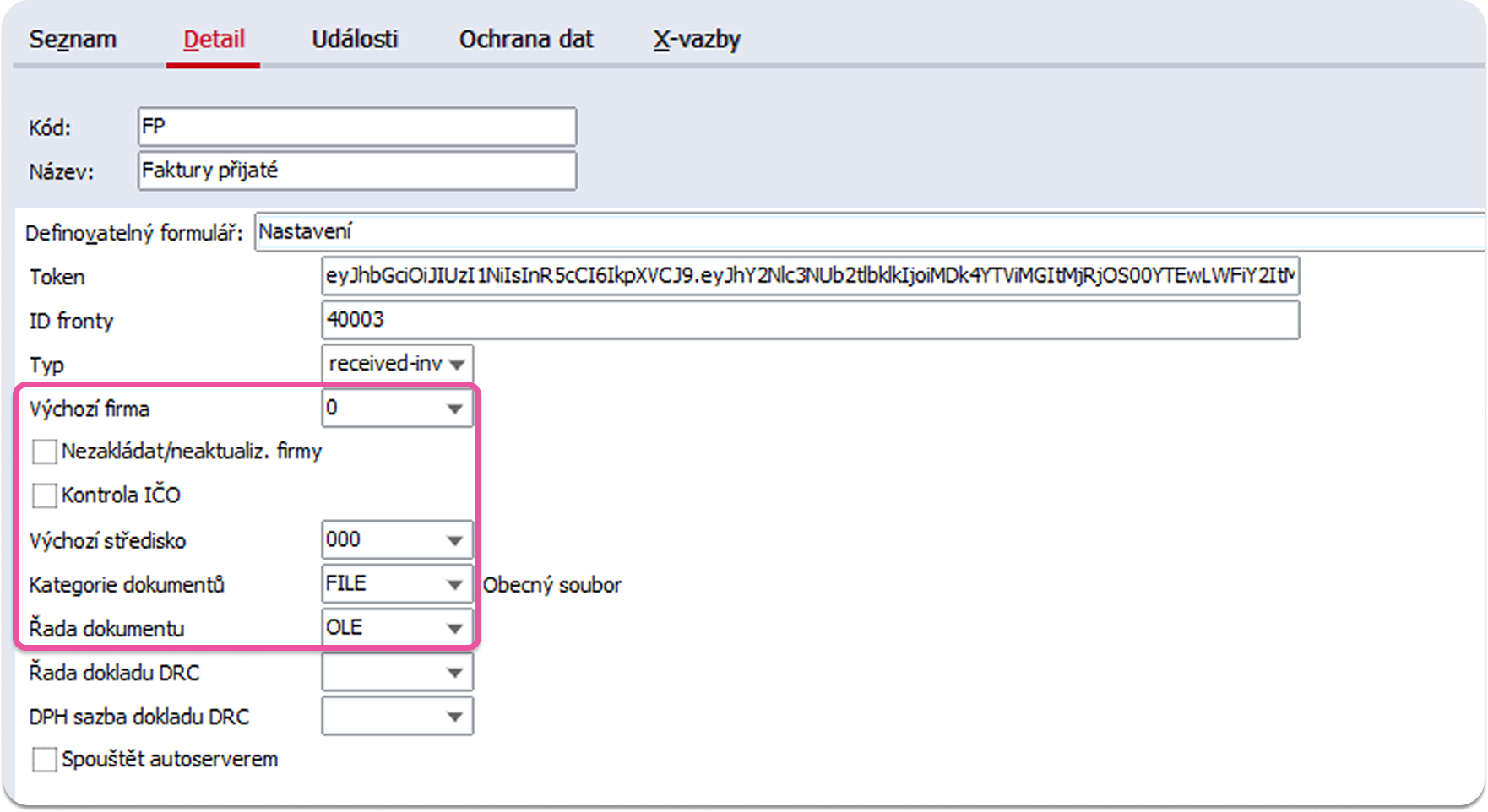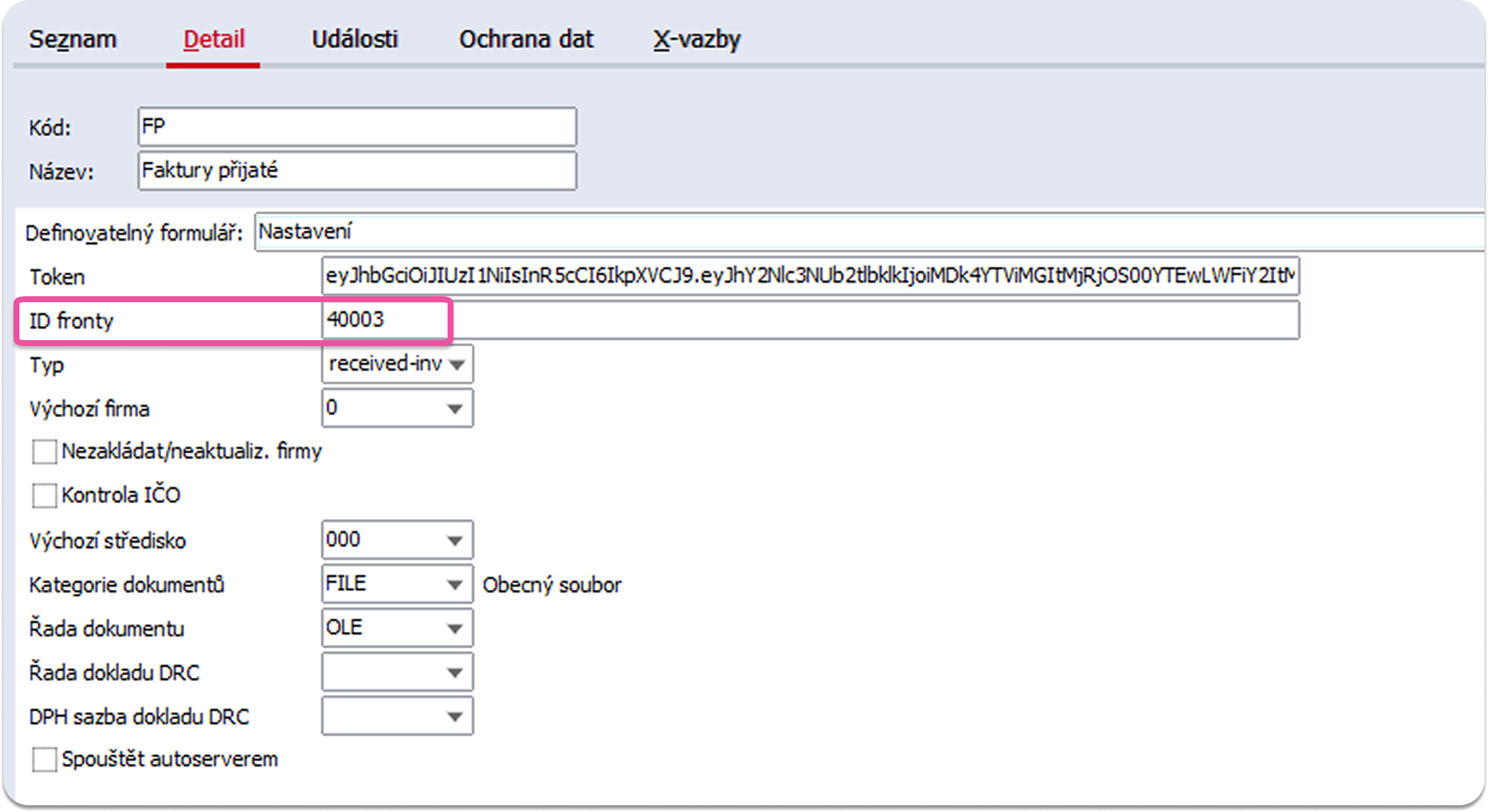 Pokud chcete připojit i další fronty jako jsou účtenky či vydané faktury, tak v připojení je důležité uvést správné ID fronty a nastavit TYP: