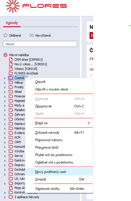 Ve stromě Agendy si najděte místo, kam byste chtěli agendu Digitoo.ai umístit, klikněte zde pravým tlačítkem a zvolte možnost "Nový podřízený uzel".