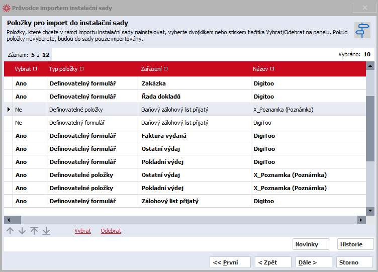 Vyberte soubor s instalační sadou a pokračujte v dalších krocích instalací a ve chvíli, kdy se dostanete do kroku, kde je potřeba vybrat položky pro import do instalační sady, průvodce vyhledá změněné položky. Při aktualizaci propojení na Flores potřebujete vybrat všechny položky. Proto označíme nevybrané a necháme je tlačítkem Vybrat přidat také, a to tak, aby ve sloupci “Vybrat” bylo Ano.