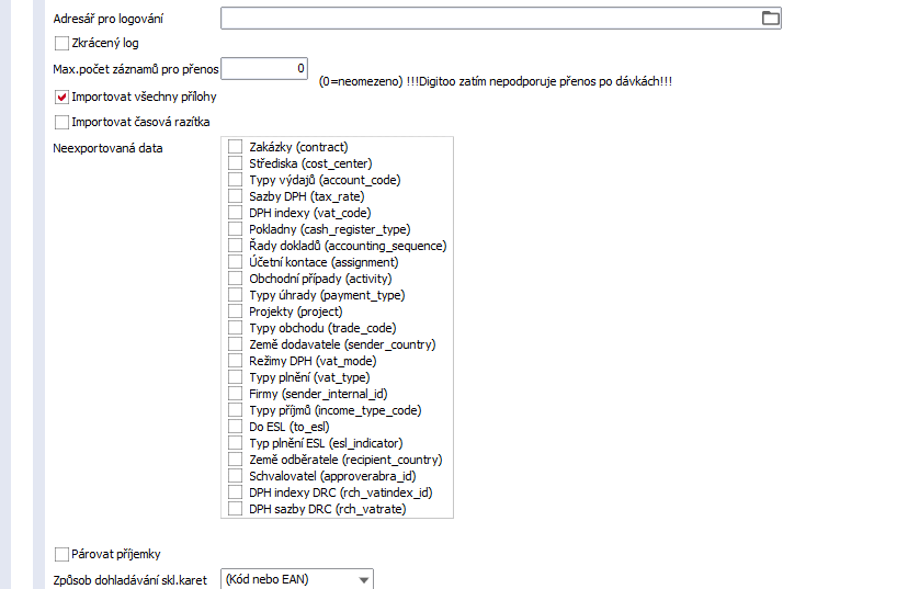 Pokud chcete stahovat kromě samotného dokladu i jeho přílohy z Digitoo.ai, tak v nastavení v číselníku Digitoo.ai musíte zatrhnout "Importovat všechny přílohy".