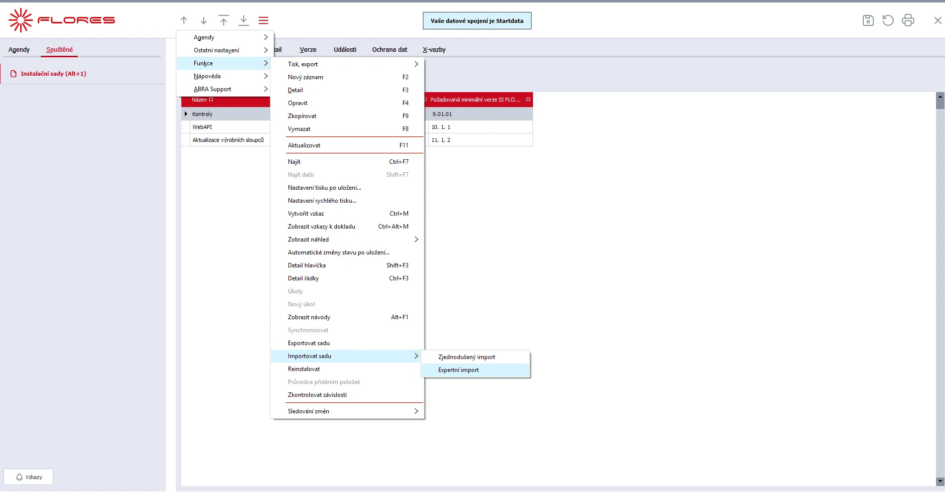 Spusťte váš informační systém Flores a otevřete agendu 'Instalační sady'. Zvolte záložku Seznam, kde v nabídce v pravé části klikněte na ‘Funkce’- ‘Importovat sadu’ - a zde zvolte možnost ‘Expertní import’.