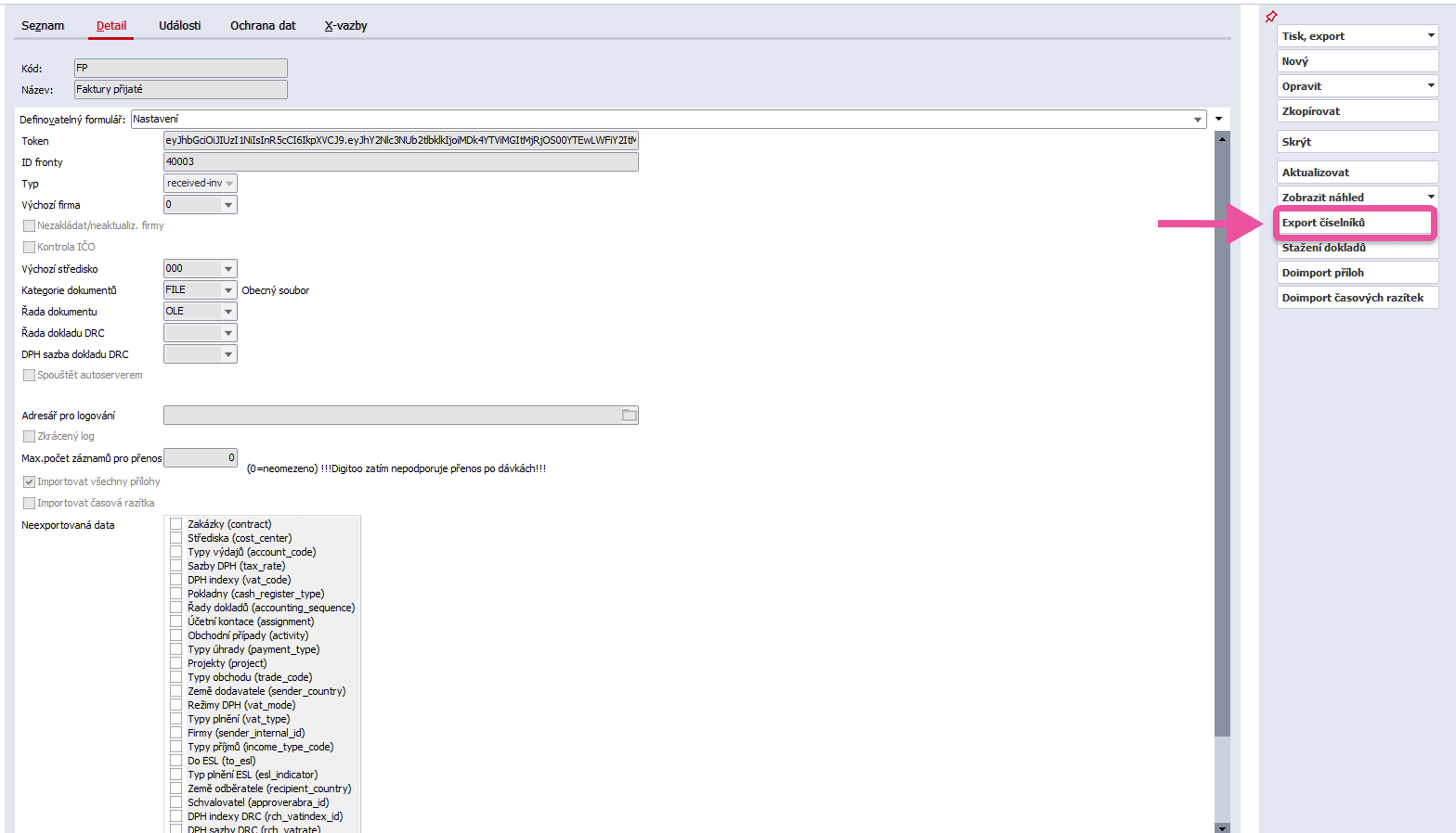 Všechno nastavení uložte kliknutím na tlačítko ‘Uložit’ v pravém horním rohu. Následně klikněte na ‘Export číselníků’, díky kterému se přenesou všechny číselníky z vašeho účetního systému do Digitoo.ai aplikace.