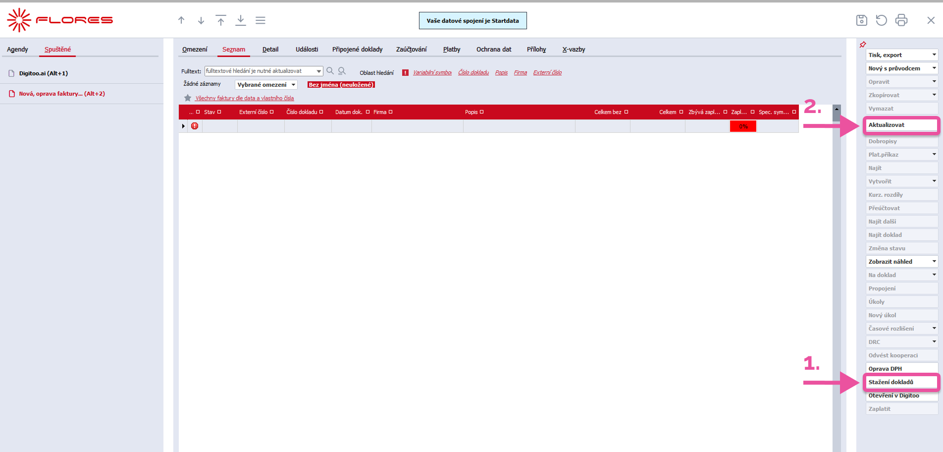 Když odešlete faktury z Digitoo.ai aplikace, je pro jejich přenos do Flores nutné kliknout na tlačítko ‘Stažení dokladů’ v agendě Faktury přijaté. Poté se otevře okno s potvrzením o přenesených dokladech. Pro zobrazení nových faktur klikněte na tlačítko ‘Aktualizovat’.