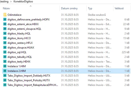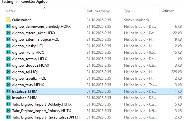 Poté otevřete složku KonektorDigitoo a spusťte soubor Instalace 1.HIM. Po spuštění se plugin nainstaluje do Helios do vámi zvolené databáze.
