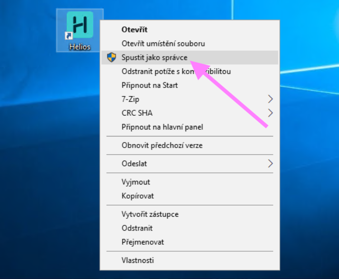Helios je třeba při prvním spuštění na každém počítači, kde se bude Digitoo plugin používat, spustit jako správce (kliknutím pravým tlačítkem myši na ikonu Helios a vybrat “Spustit jako správce”).