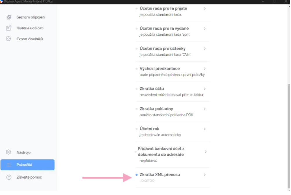 Jakmile máte v Money S3 konfiguraci připravenou, tak nyní je třeba zadat tuto zkratku v Agentovi. Zkratku nastavíte v Digitoo Agentovi na záložce “Pokročilé” do pole „Zkratka XML přenosu“.