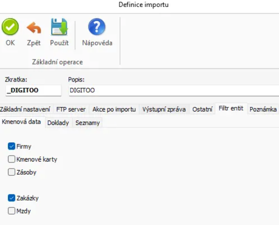 - V sekci Filtr entit - Kmenová karta zaškrtnout: Firmy a Zakázky.