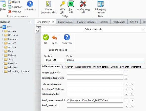 - Na tomto odkazu je ke stažení zazipovaná přednastavená konfigurace _DIGITOO.xml. Přejděte do sekce Základní nastavení, kde vložíte staženou konfiguraci _DIGITOO.xml. Otevře se Definice importu - kliknout na tři tečky v konfiguraci zpracování - vložit přednastavenou konfiguraci. Následně potvrďte tlačítkem OK a nová konfigurace se uloží.