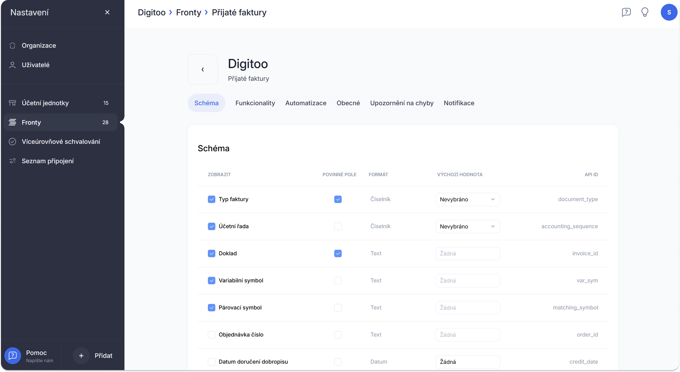 Po rozkliknutí můžete upravit schéma vyčítaných údajů pro veškeré doklady z dané fronty, a zapnout či vypnout určitá pole, například: