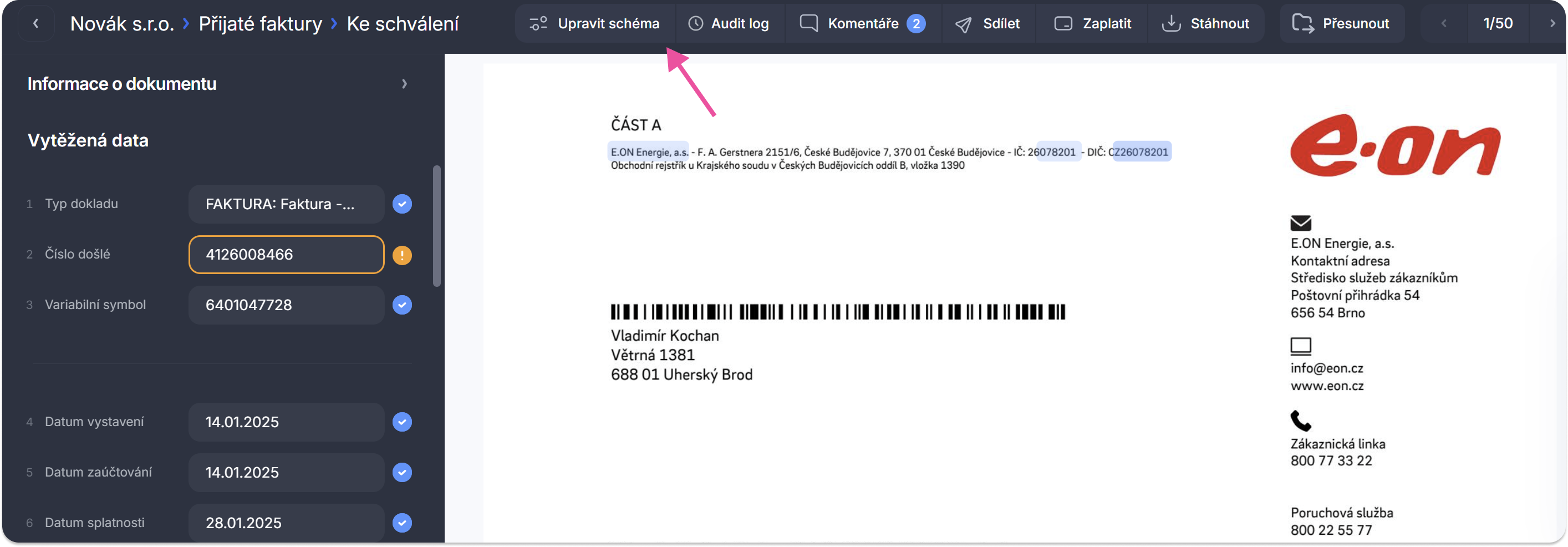 Třetí možností nastavení schématu je přes otevřením detailu dokladu, kde v horním řádku naleznete možnost "Upravit schéma fronty".