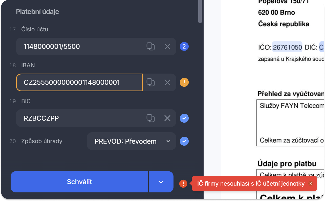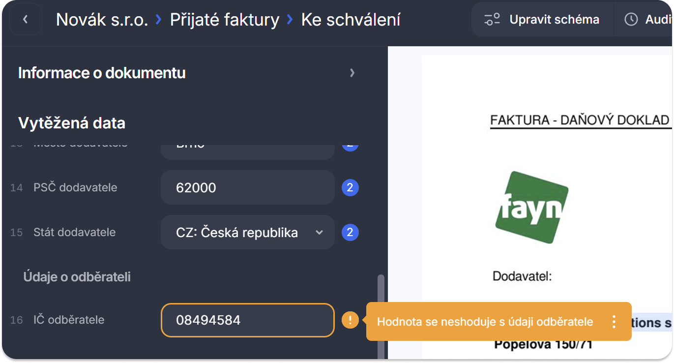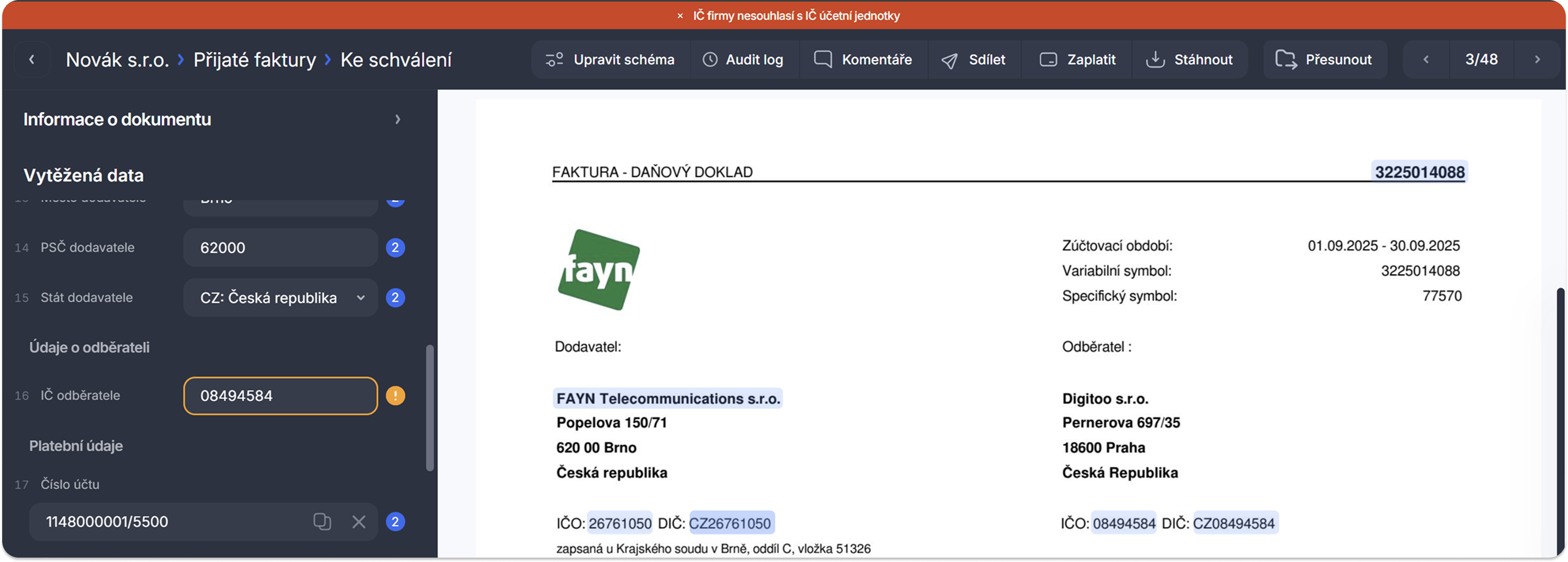 Pokud jste při založení účetní jednotky vyplnili její IČO nebo DIČ, tak můžete využívat funkc pro kontrolu toho, že doklad je nahraný pro správnou firmu, a abyste byli upozornění, že nahraný doklad do dané firmy nepatří.