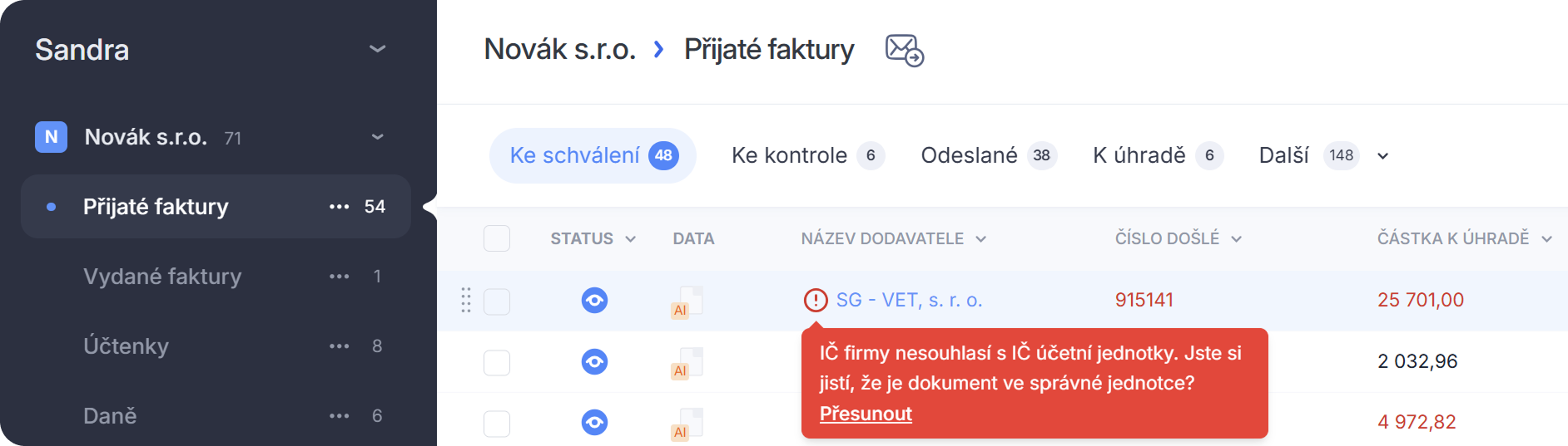 Když myší najedete na vykřičník upozorňující na tuto nesrovnalost, nabídne se vám možnost doklad rovnou přesunout, abyste nemuseli chodit do jeho detailu.