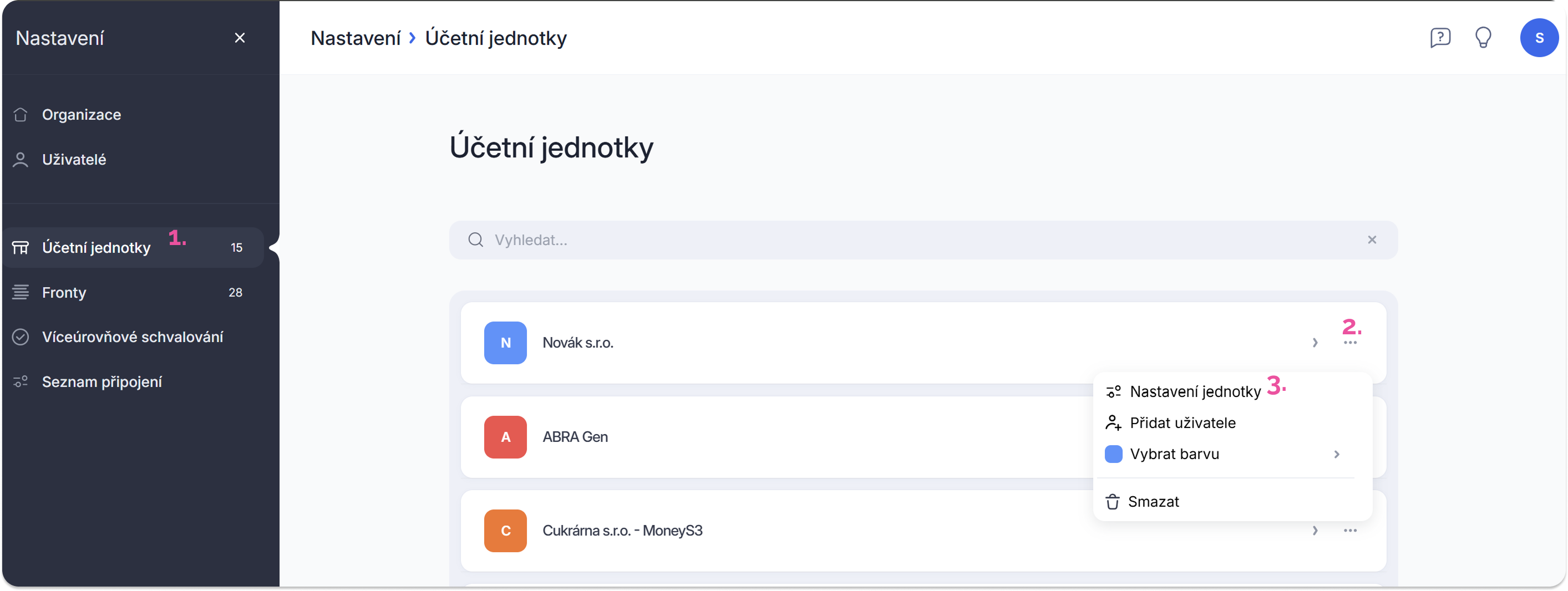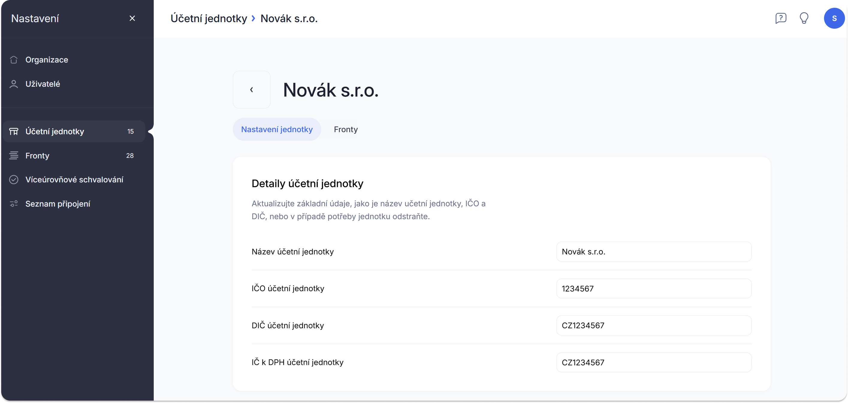 Tohle je možné nastavit i dodatečně (jedině superadmin a vlastník) přes Nastavení - Účetní jednotky - najděte si danou firmu - klikněte na tři tečky a zvolte možnost Nastavení účetní jednotky.