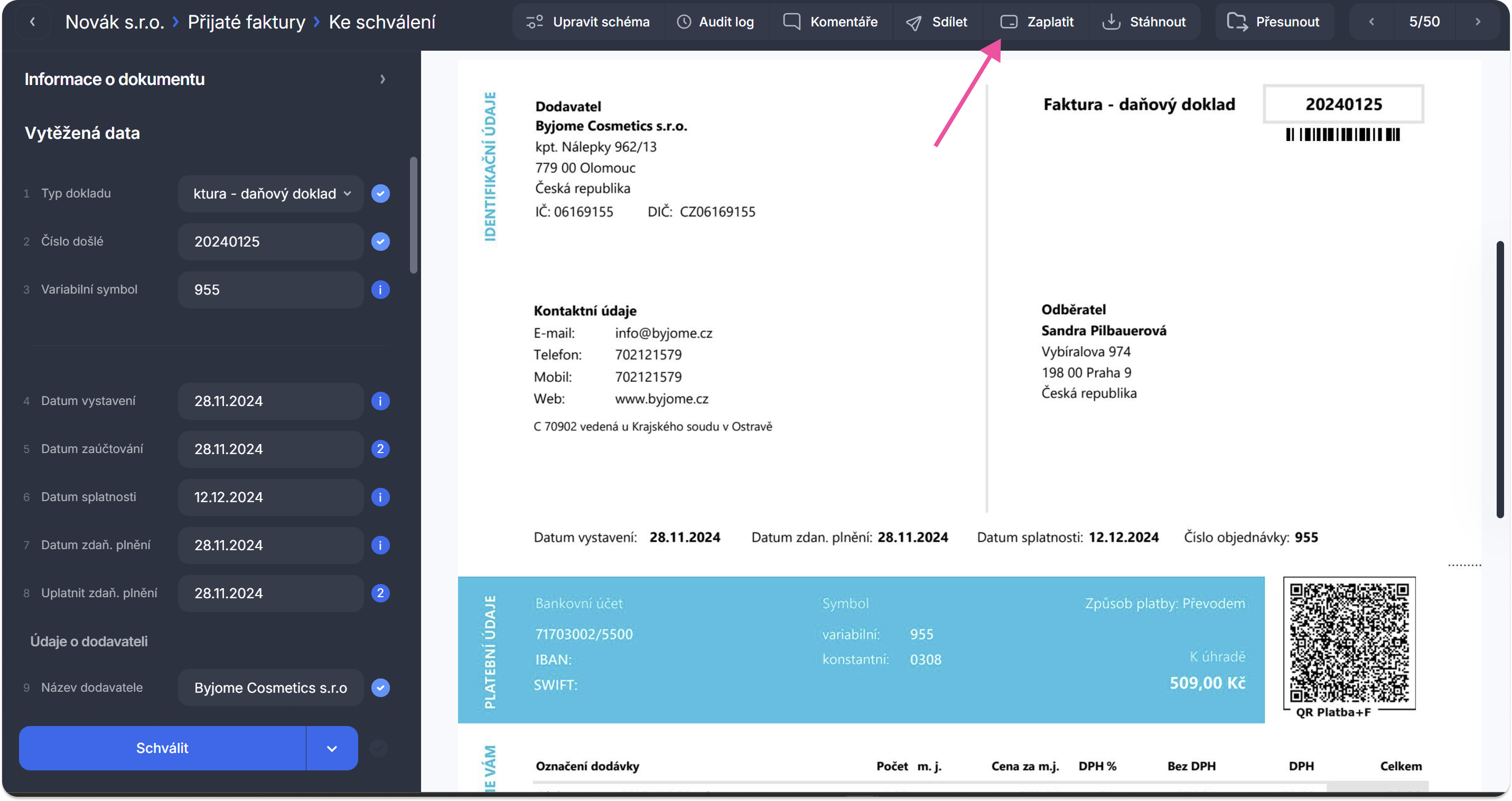 V případě, že faktura obsahuje veškeré náležitosti potřebné k vytvoření kódu, vygeneruje se QR kód, nastavíte datum splatnosti a můžete přes vaše bankovnictví ihned uhradit. Bohužel nevíme, jestli jste QR kód opravdu přes mobilní bankovnictví naskenovali a tedy doklad zaplatili, proto musíte následně kliknout na tlačítko "označit za uhrazeno