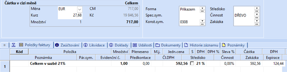 Pokud je na dokladu cizí měna, tak se také vytvoří položka.