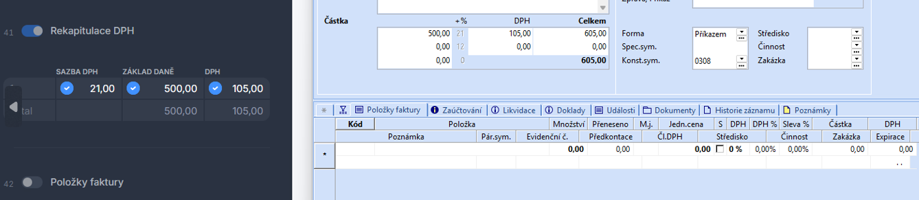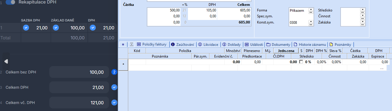 Virtuální položka se také vytvoří, pokud zadané částky nebudou souhlasit, v tomto případě se vytvoří virtuální položka “dopočet správnosti zaokrouhlení”.