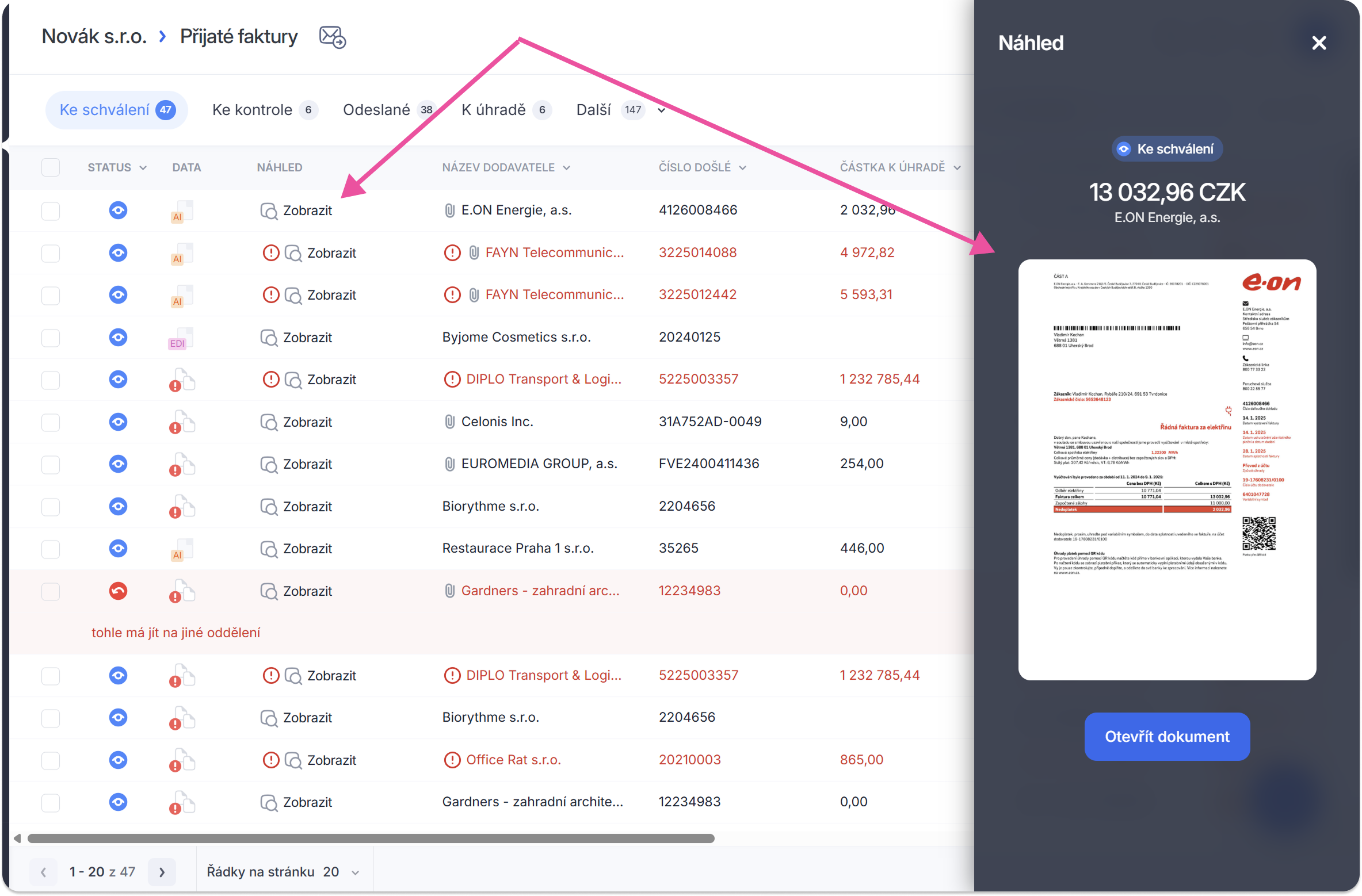 Zobrazí se vám pak v přehledu mezi prvním sloupci "náhled" a možnost zobrazit a po kliknutí se vám zobrazí miniatura (náhled) dokladu: