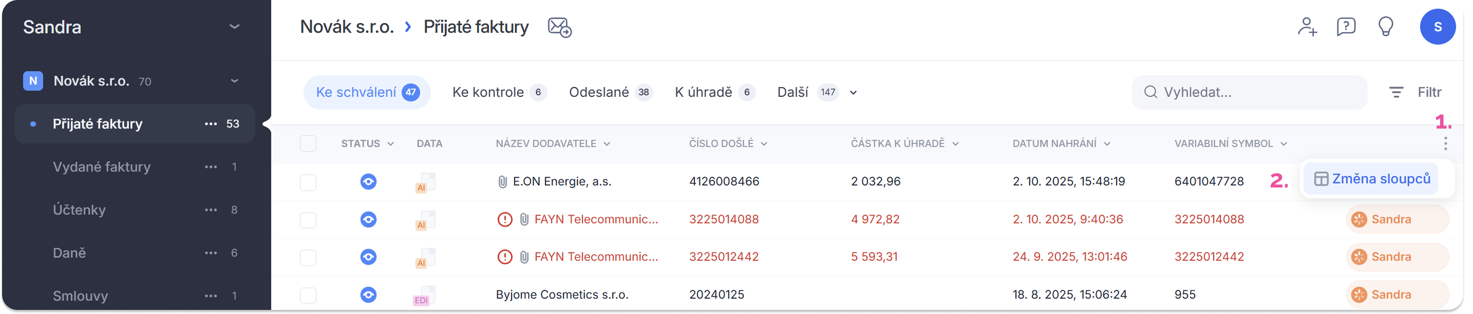 Sloupce si nastavuje každý uživatel sám pro sebe a funguje napříč všemy záložkami, tedy Ke schválení, Ke Kontrole, Odeslané atd.