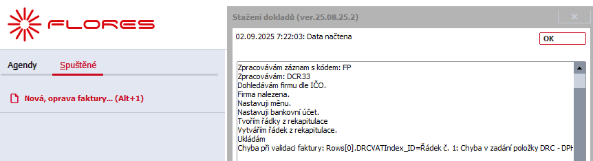 Pokud je v Parametrech firmy nastaveno “Automaticky”, tak se ukáže chyba a v logu je tato hláška: “Chyba při validaci faktury: Rows[0].DRCVATIndex_ID=Řádek č. 1: Chyba v zadání položky DRC - DPHIndex.”