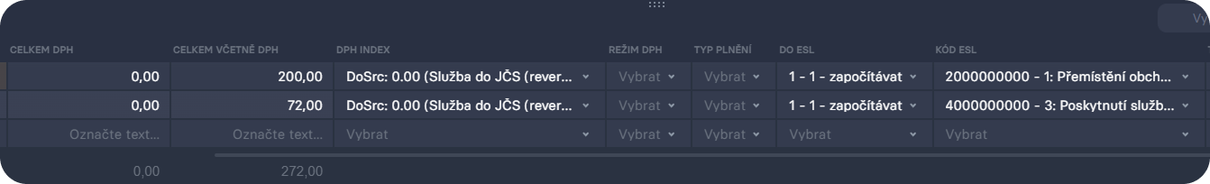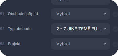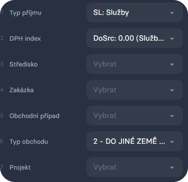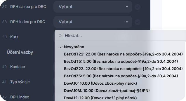 V aplikaci existují pole DPH sazba pro DRC a DPH index pro DRC ve kterých můžete vybrat potřebné hodnoty k vytvoření dokladů k samovyměření DPH.