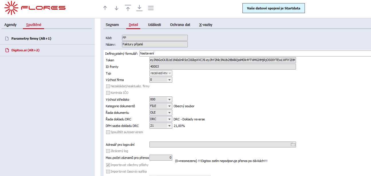 Druhá možnost možnost je nastavení v Flores v agendě Digitoo.ai. K tomu, aby se v Flores správně a automaticky vytvářely doklady k samovyměření DPH je potřeba mít nastaveno v agendě Digitoo.ai řadu dokladů a výchozí DPH sazbu pro reverse charge.