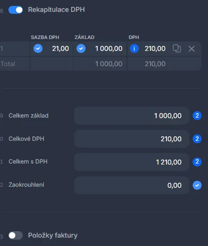 3. Rekapitulace DPH je zapnutá s vyplněnou sazbou DPH a zároveň jsou zapnuté i Položky s vyplněnou sazbou DPH, což znamená, že sazby se musí v Rekapitulaci DPH a na Položkách shodovat