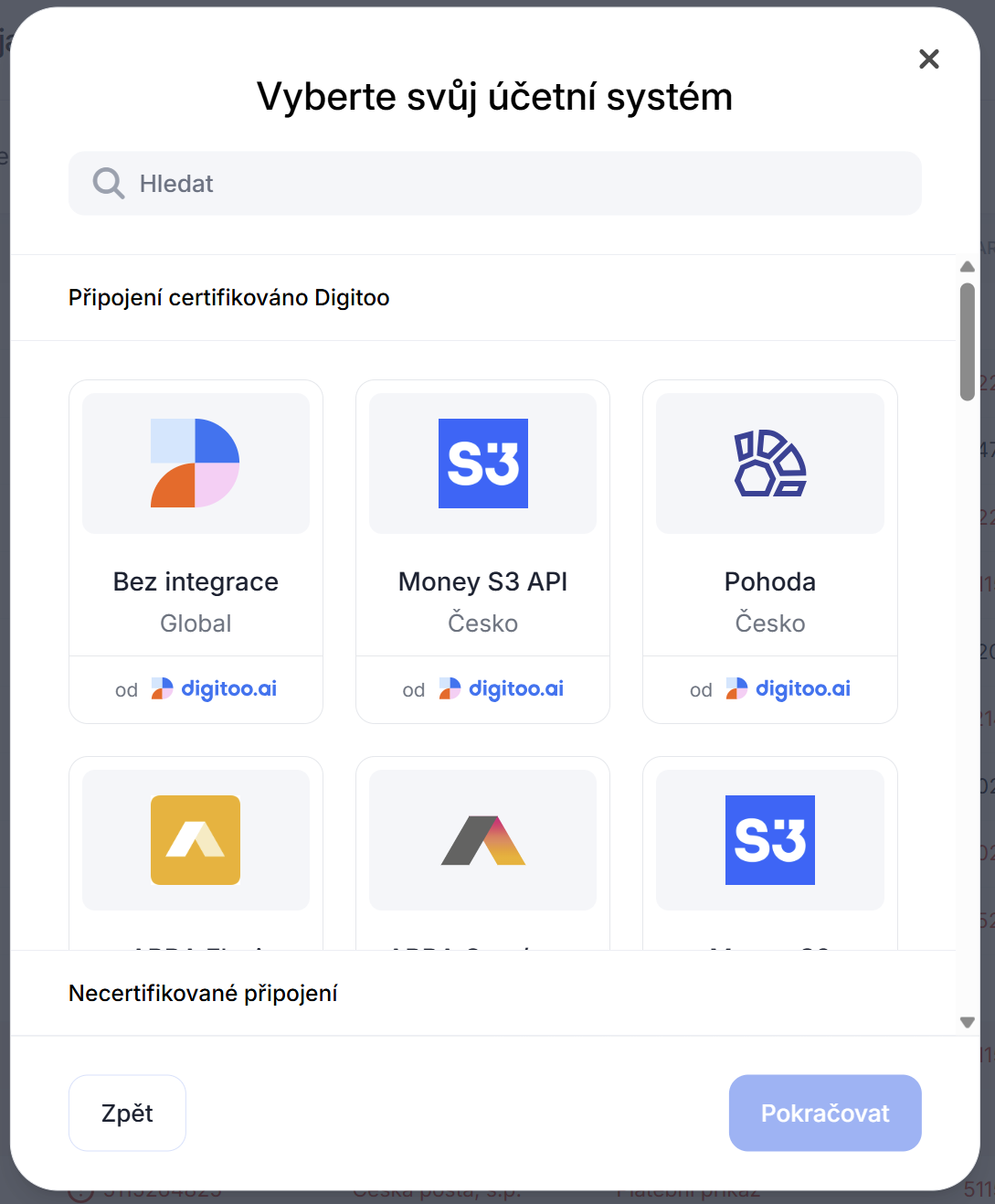 V případě, že používáte účetní systém, který nyní nepodporujeme, vyberte Bez integrace. Možností jak pracovat s Digitoo.ai i bez propojení naleznete v samostatném článku.