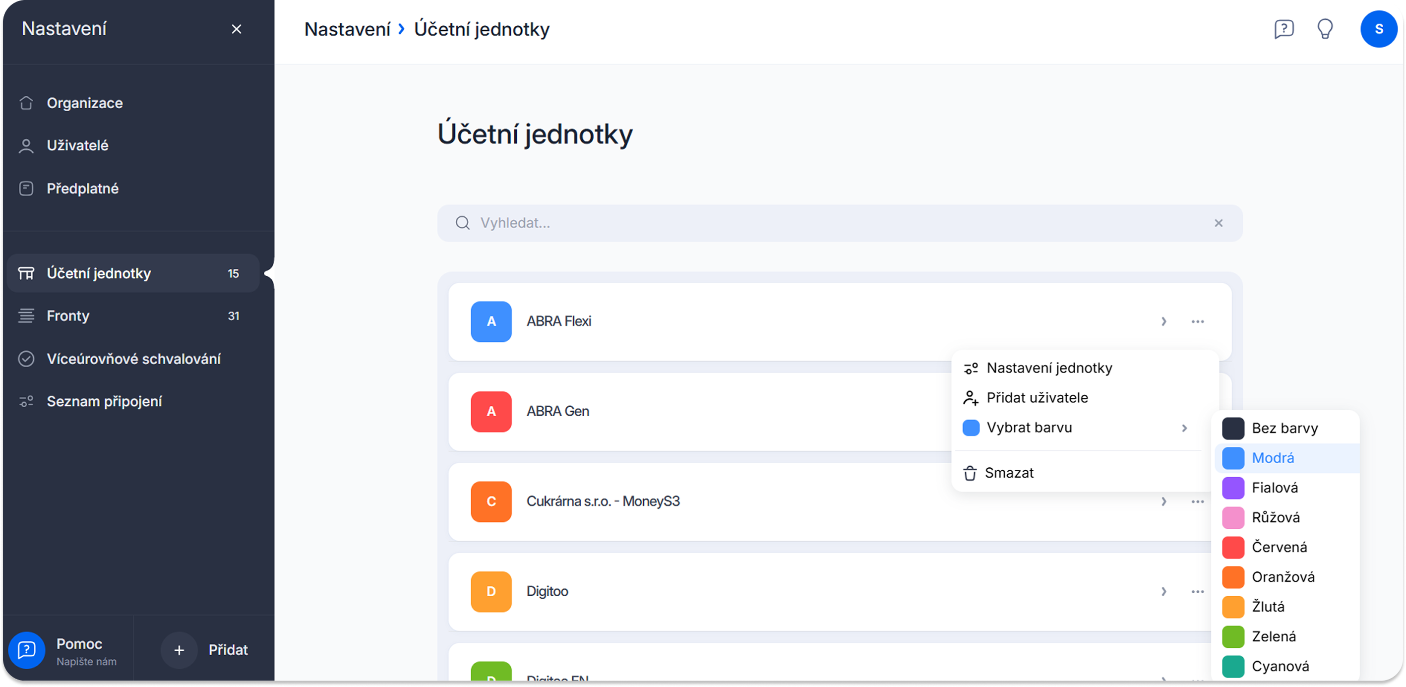 Stačí si tedy otevřít Nastavení - Účetní jednotky - kliknout na tři tečky u názvu a zobrazí se vám možnost vybrat/změnit barvu: