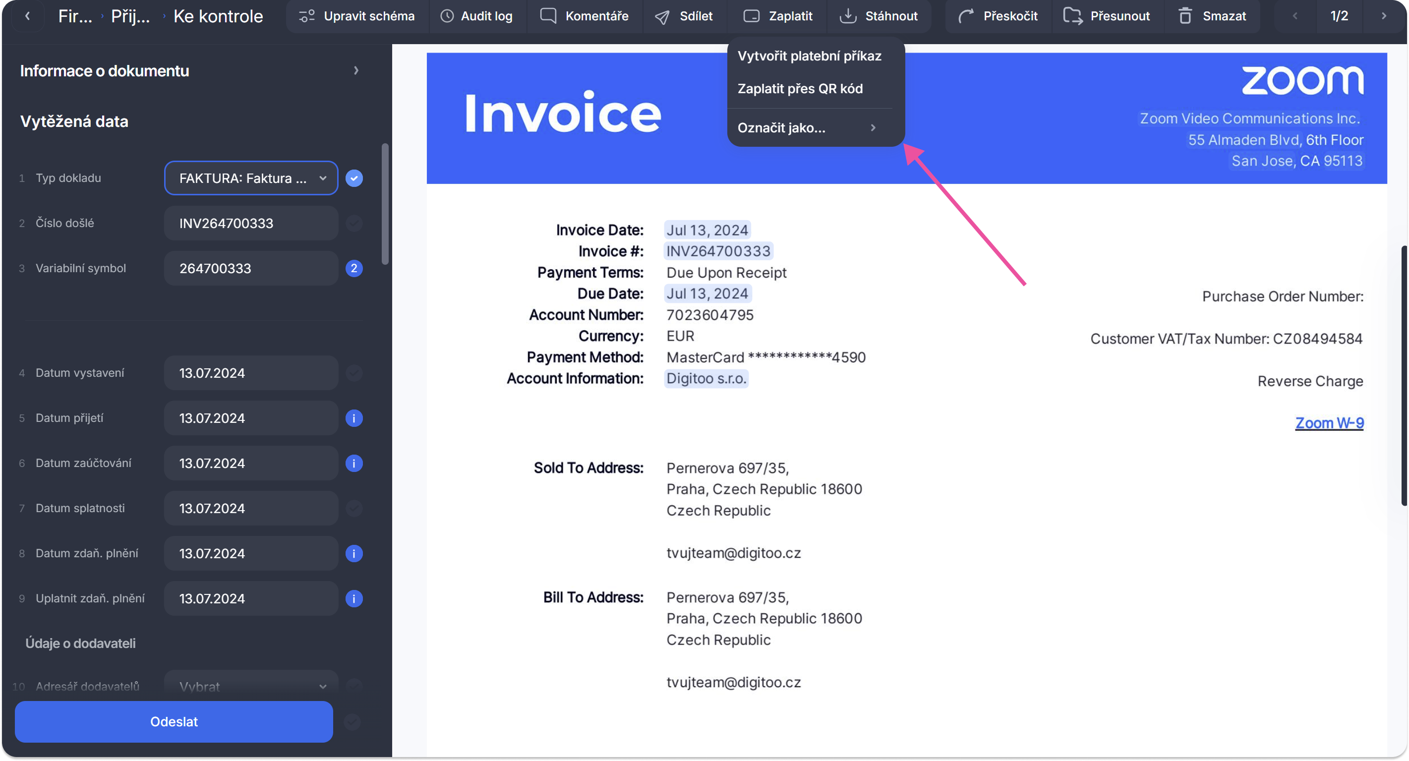 Jednotlivé doklady, které nahráváte do Digitoo.ai si můžete značit statusy platby, abyste měli přehled o zaplacených či nezaplacených fakturách. Nezaplacené faktury si pak můžete vytřídit na jednu hromadu pro zaplacení.