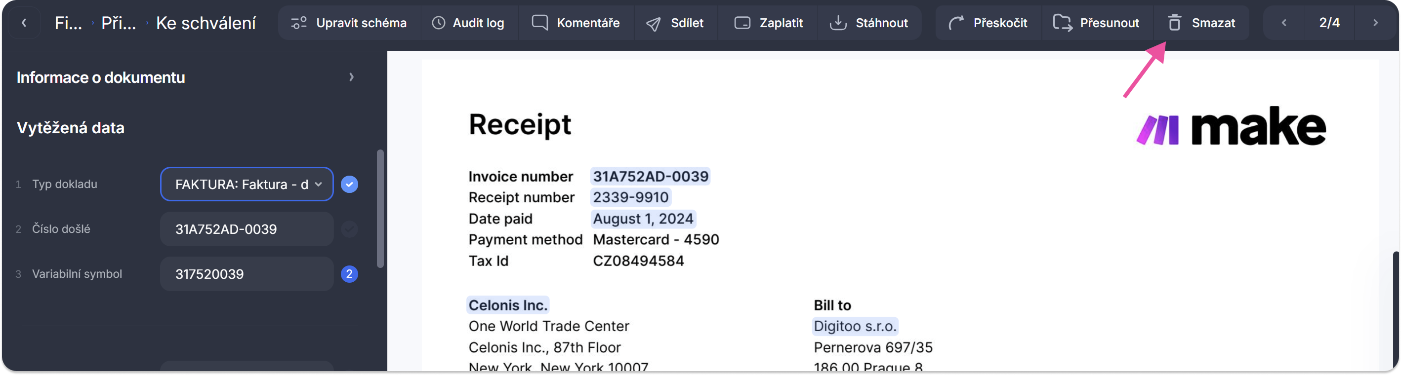 anebo na detailu faktury klikněte na ikonu koše vpravo nahoře: