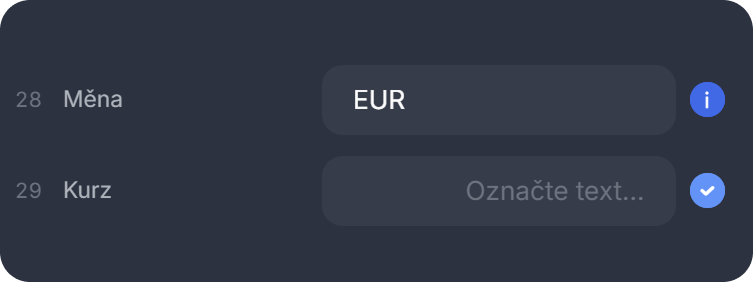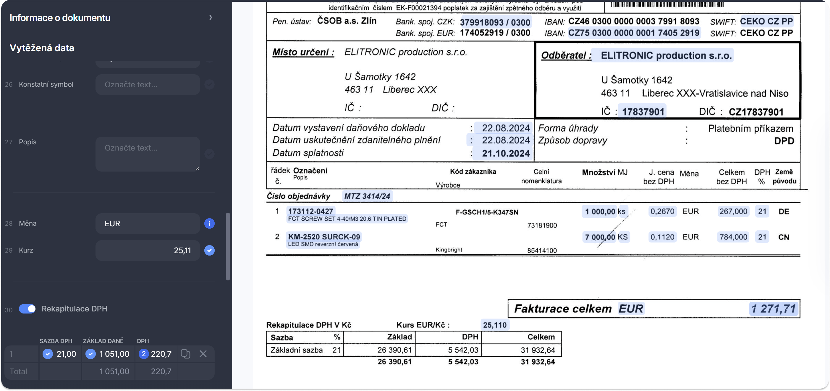 Doklad je nutné zadat v jedné měně stejně, jako byste ho zadávali přímo v účetním programu. Tohle je důležité zejména pro případy, kdy dodavatel uvádí na faktuře částky ve dvou měnách, a to původní a přepočítané. Je na vás se pak rozhodnout, jestli doklad chcete zadat v originální měně, použít kurz uvedený na faktuře, nebo kurz z vašeho účetního programu.