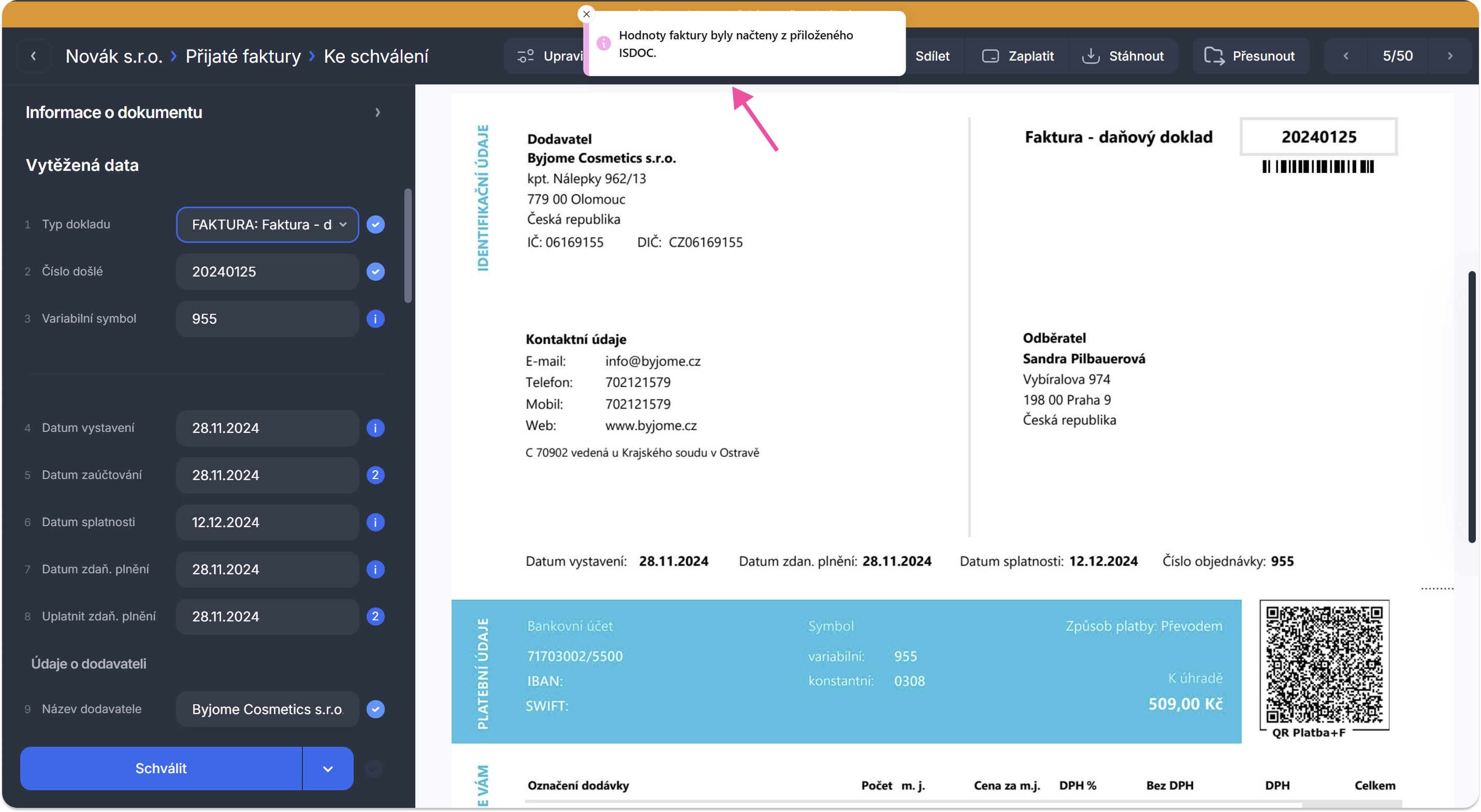 Druhé se zobrazí, když fakturu otevřete. V horní části obrazovky vyskočí upozornění, že data byla přečtena z přiloženého ISDOC.
