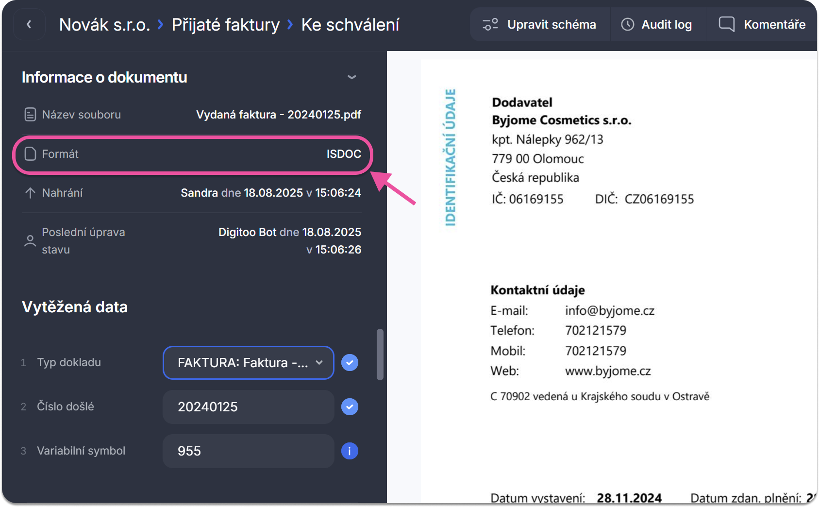 Jeden z formátů dokladů, které je možné nahrávat do Digitoo.ai jsou PDF s vnořeným ISDOC. Tyto doklady jsou zdarma a ze zakoupeného balíčku se vám neodečítají.